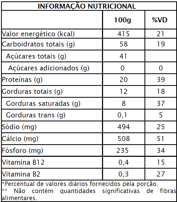 Alergênicos: contém derivados de leite. Pode conter derivados de soja.