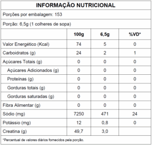 Creatina micronizada, ácido cítrico, bicarbonato de sódio, carbonato de sódio, aromatizante idêntico ao natural, sílica (antiumectante), edulcorantes artificiais sucralose e acessulfame de potássio, corante artificial caramelo IV.