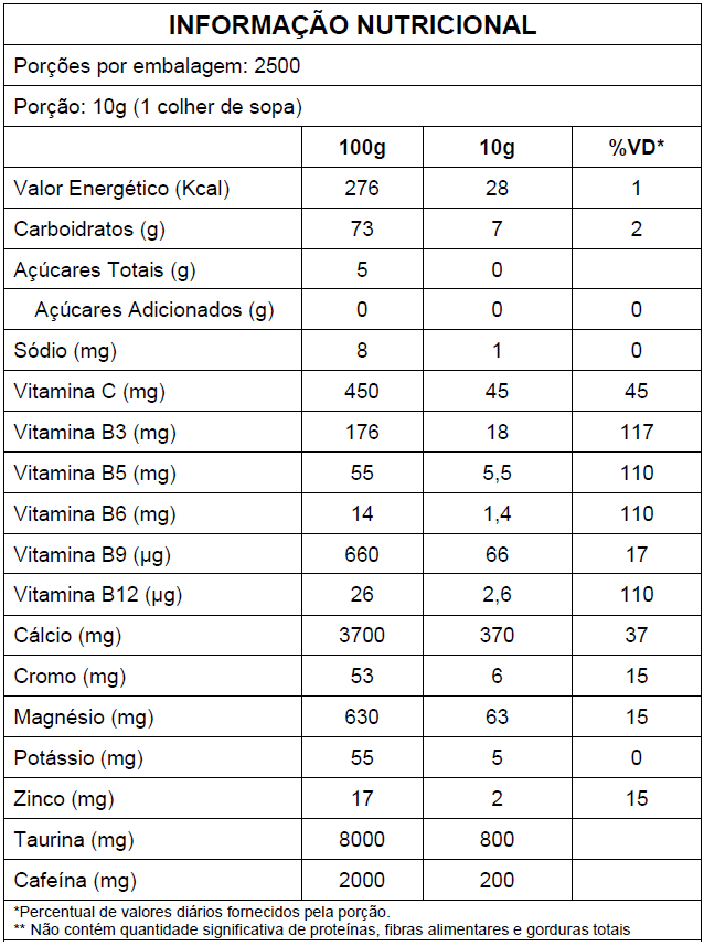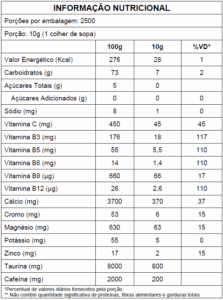 Maltodextrina, mix de vitaminas e minerais (vitaminas B3, B5, B6, B9, B12, cálcio, cromo, magnésio, potássio, zinco e taurina), cafeína revestida (cafeína, açúcar, amido modificado, carboximetilcelulose de sódio, goma arábica, pectina e alginato de sódio), cafeína micronizada, vitamina C revestida, ácido cítrico (acidulante), aromatizante idêntico ao natural, corante natural (spirulina e cártamo), citrato de sódio (regulador de acidez), dióxido de silício e fosfato tricálcico (antiumectantes), acessulfame-K e sucralose (edulcorantes).